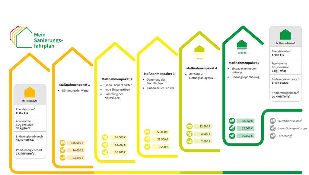 • Förderungen und Zuschüsse: Der iSFP erleichtert den Zugang zu staatlichen Förderungen, da er oft eine Voraussetzung für die Bewilligung von erhöhten Zuschüssen ist.